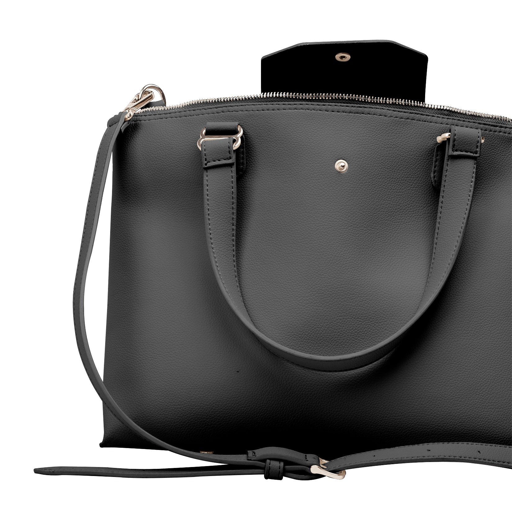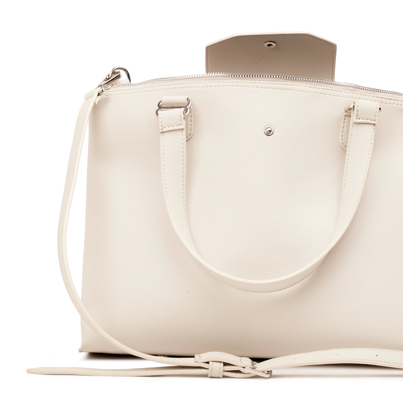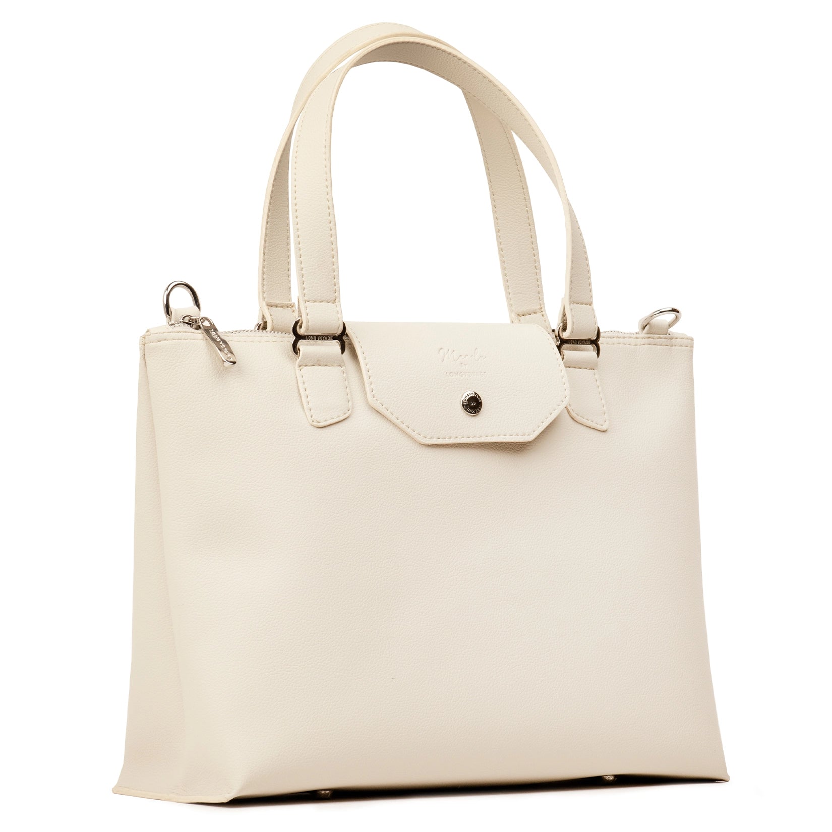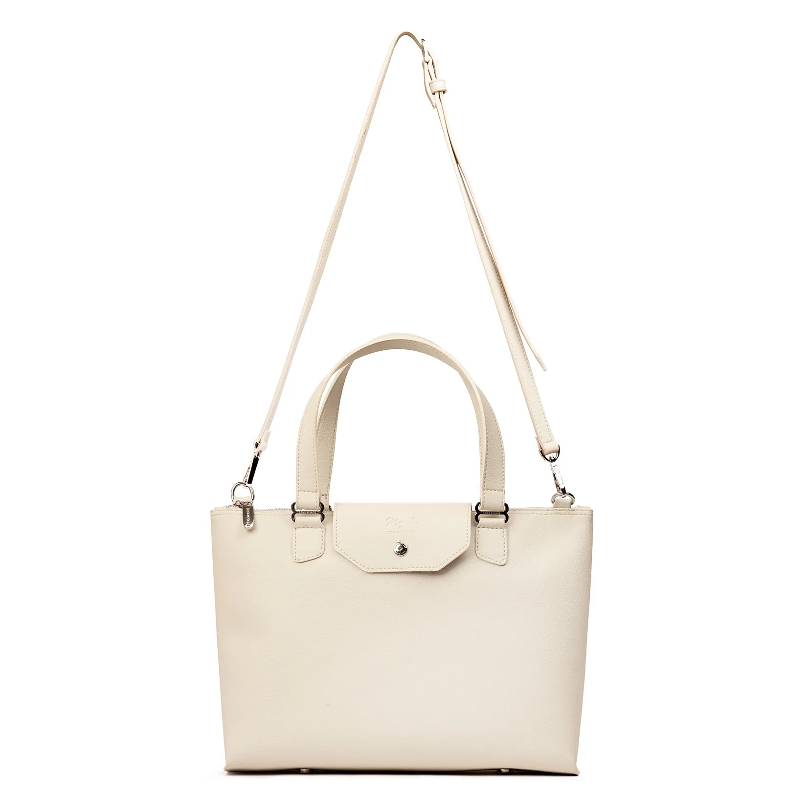 El diseño incorpora asas cortas reforzadas y una correa desmontable para llevarla al hombro o en crossbody, adaptándose a tu estilo y comodidad. Además, cuenta con cierre superior de cremallera y una tapa frontal con broche metálico que aporta un detalle refinado y distintivo.